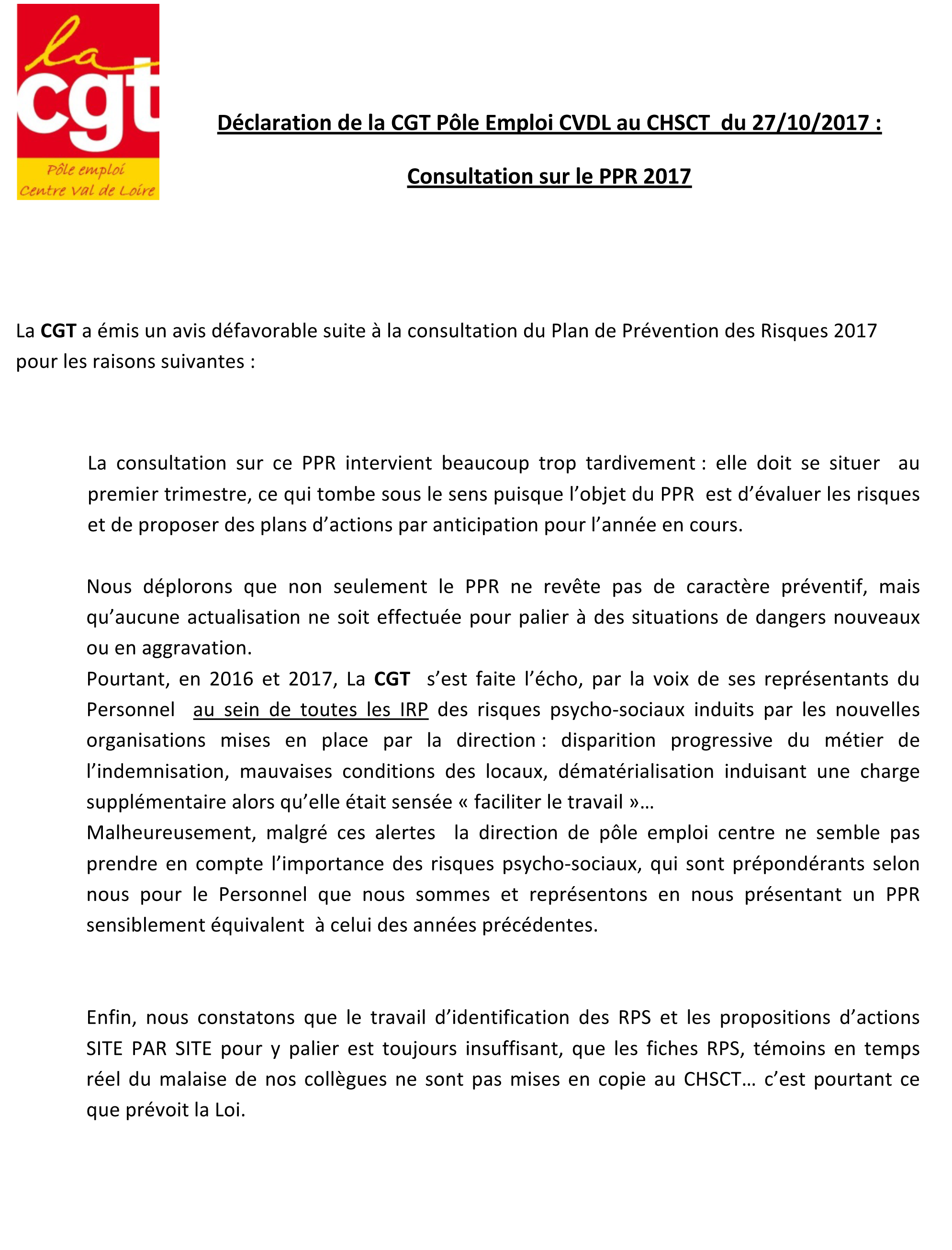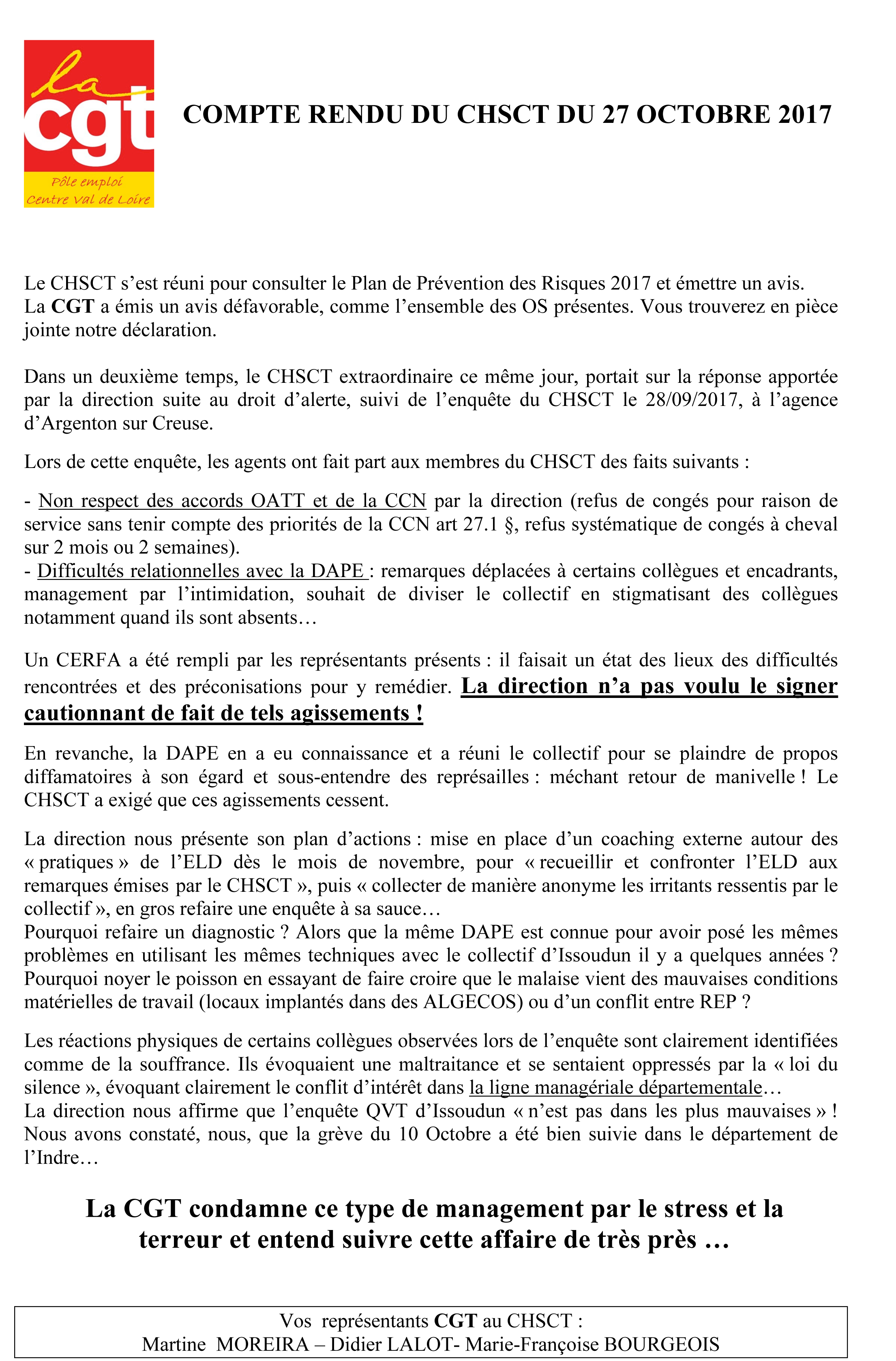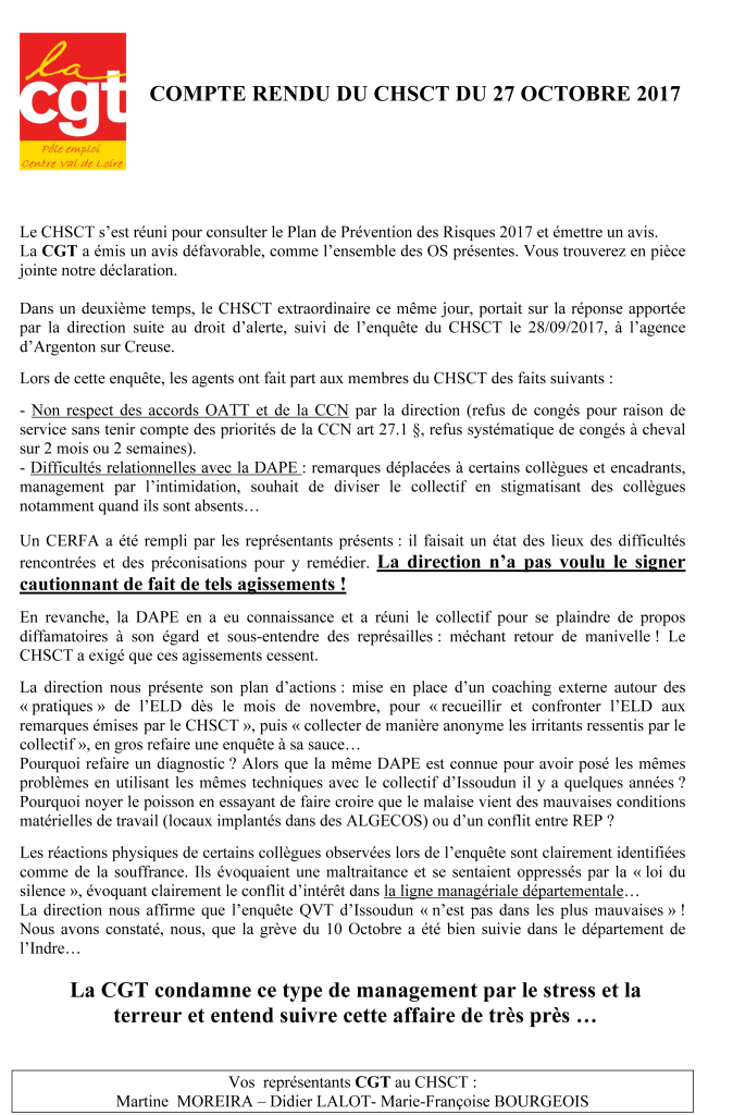 Compte rendu CHSCT du 27 octobre 2017 Tweeter Partager Partager Enquête CHSCT à Argenton sur Creuse Déclaration de la CGT Imprimer cet article Télécharger cet article 31 octobre 2017