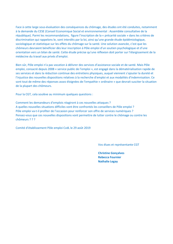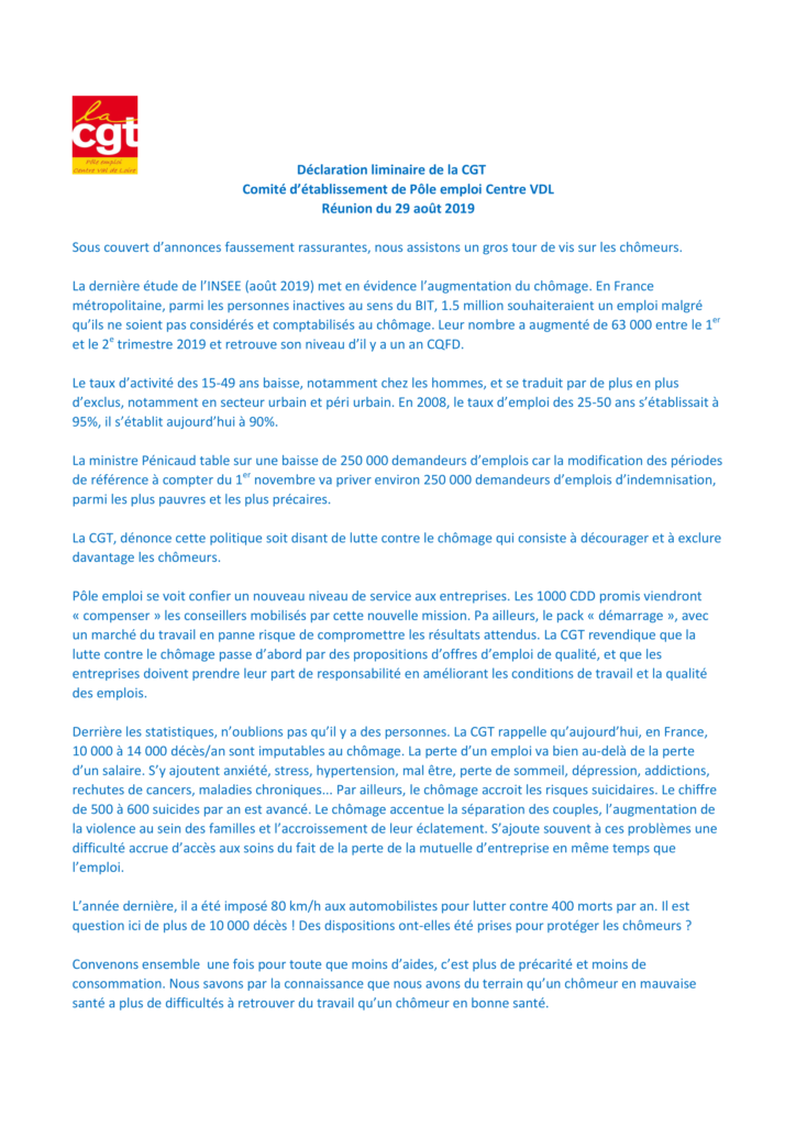 Déclaration de la CGT au comité d’établissement d’août 2019 Tweeter Partager Partager Sous couvert d’annonces faussement rassurantes, nous assistons à un gros tour de vis sur les chômeurs…. Imprimer cet article Télécharger cet article 2 septembre 2019
