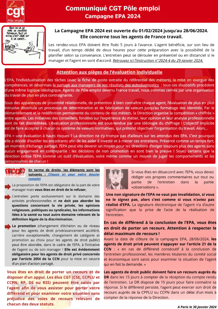 Puisque les managers sont formés pour réaliser l’EPA, La CGT vous permet de vous outiller aussi. Avant d’accepter ou refuser la proposition d’EPA, la CGT vous explique tout !