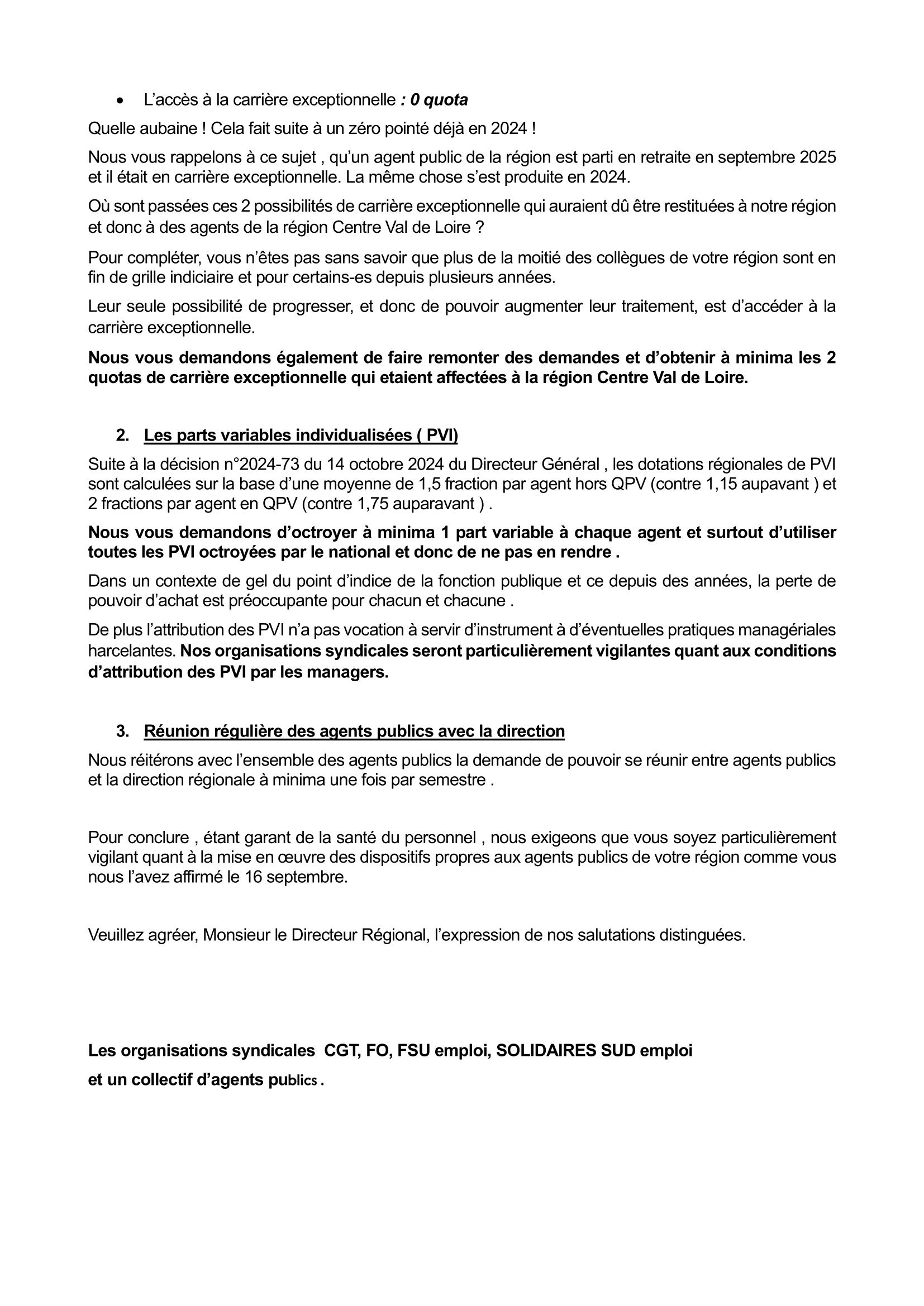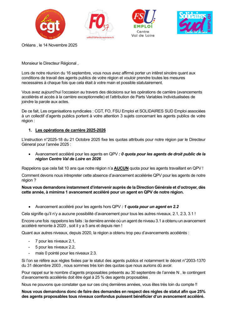 Les syndicats CGT, FO37, FSU et SUD, associés à un collectif d’agents publics portent à l’attention du DR le sujet des opérations de carrière et des parts variables ainsi qu’une demande de rencontres régulières avec les agents de droit public