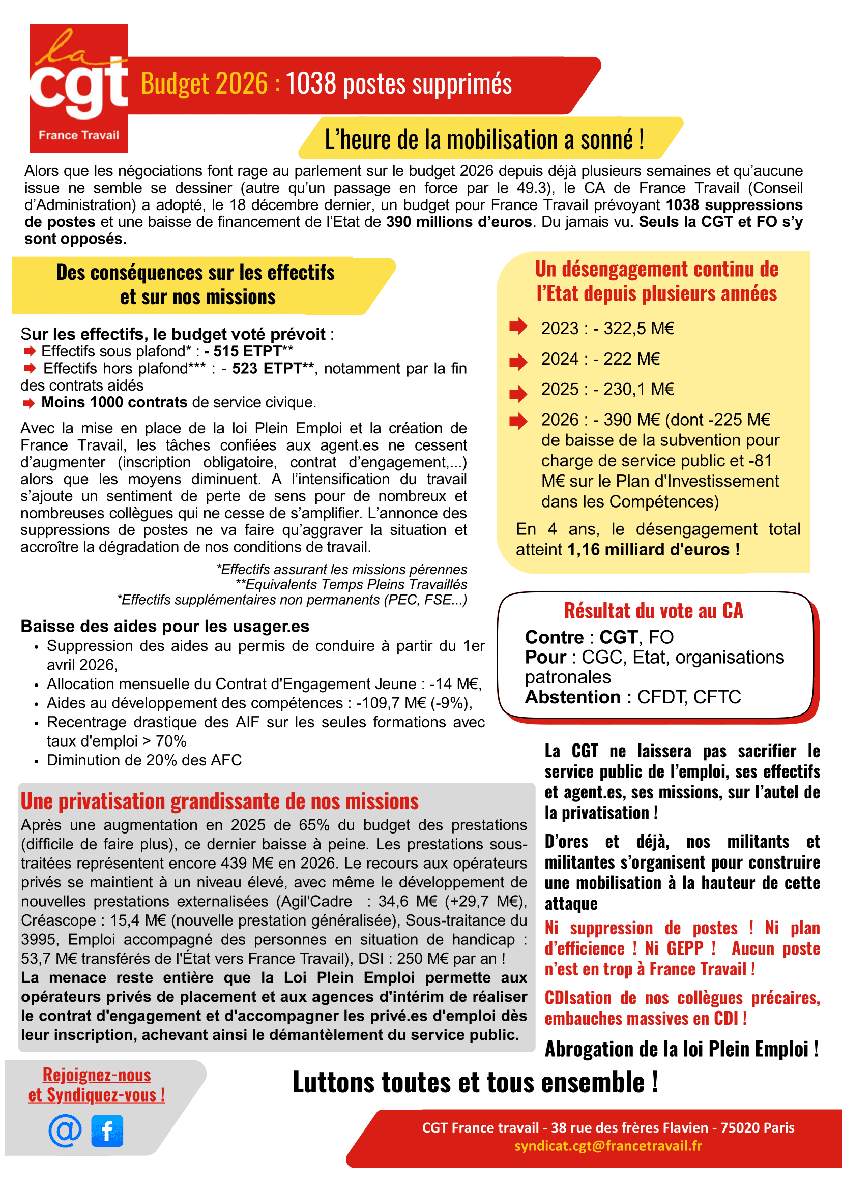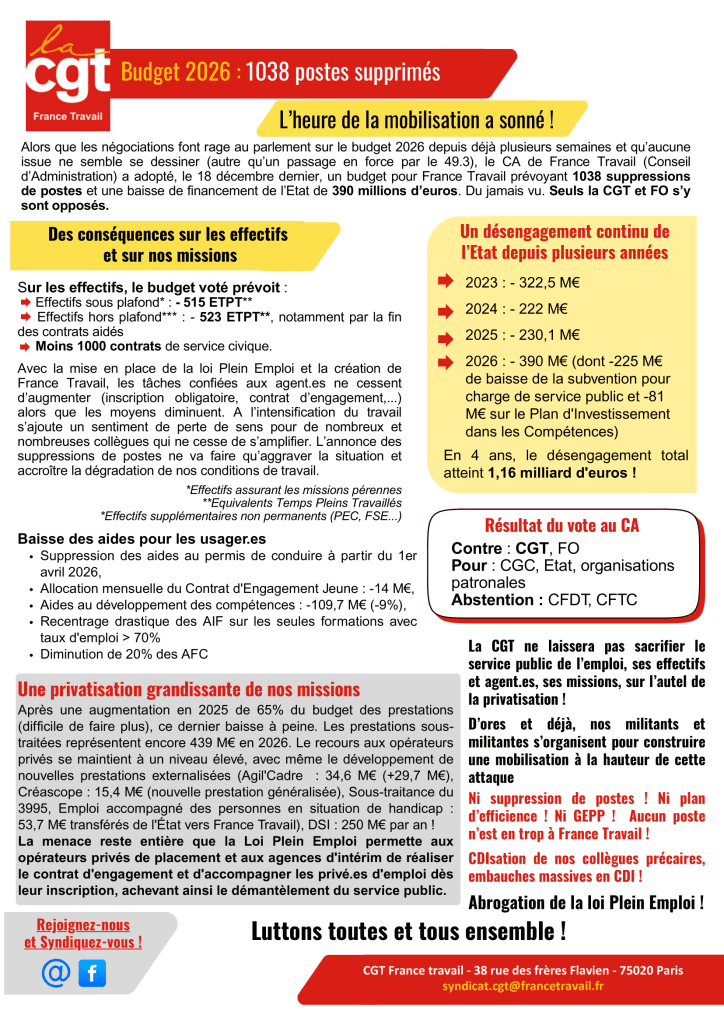 Le Conseil d’administration de France Travail a adopté, le 18 décembre dernier, un budget prévoyant 1038 suppressions de postes et une baisse de financement de l’Etat de 390 millions d’euros. Seules la CGT et FO s’y sont opposé