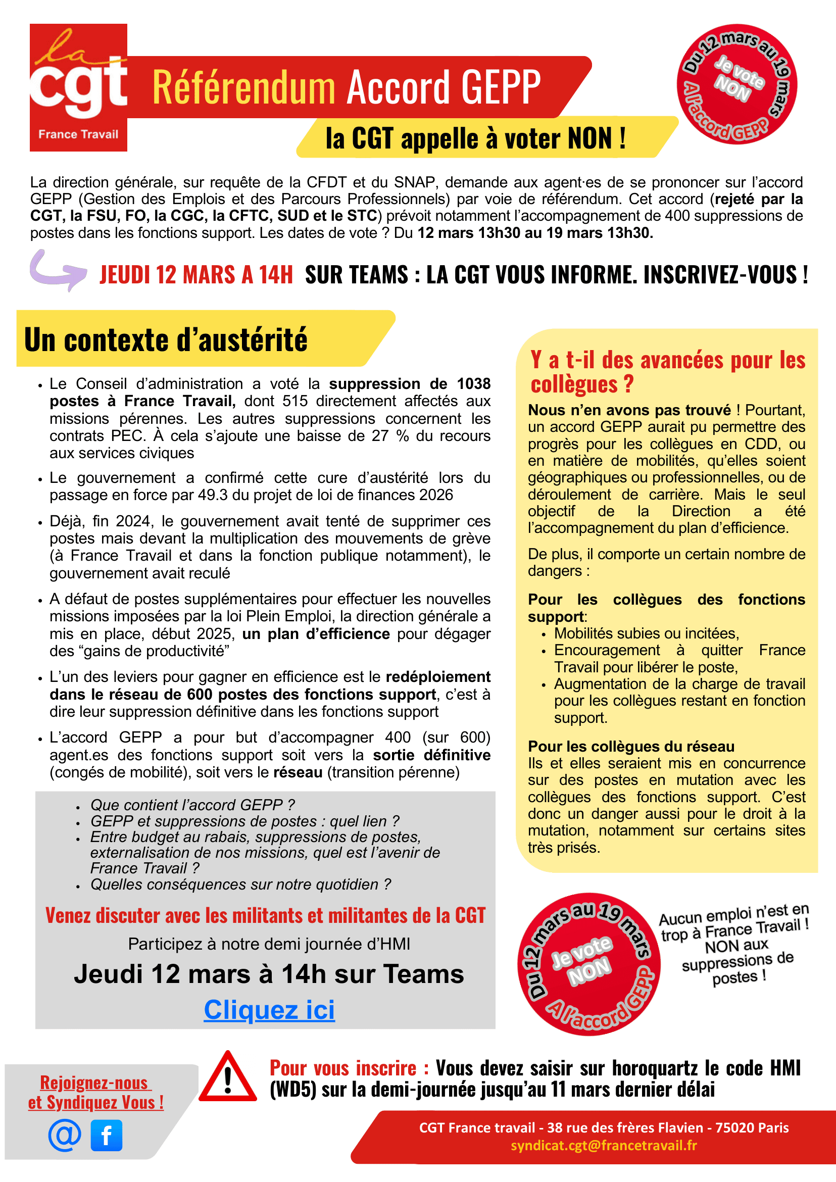 Attention : le lien HMI pour le 12 mars n’étant pas cliquable via cette publication, nous vous invitons à contacter directement votre syndicat CGT pour y avoir accès : Syndicat.CGT-Centre@francetravail.fr
